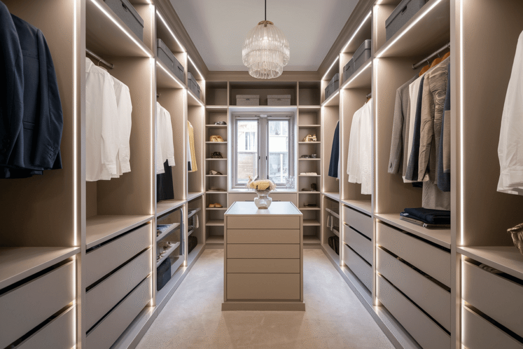 Luxurious, organised spaces supplied and installed with bespoke shelving, hanging areas, drawers, and lighting.